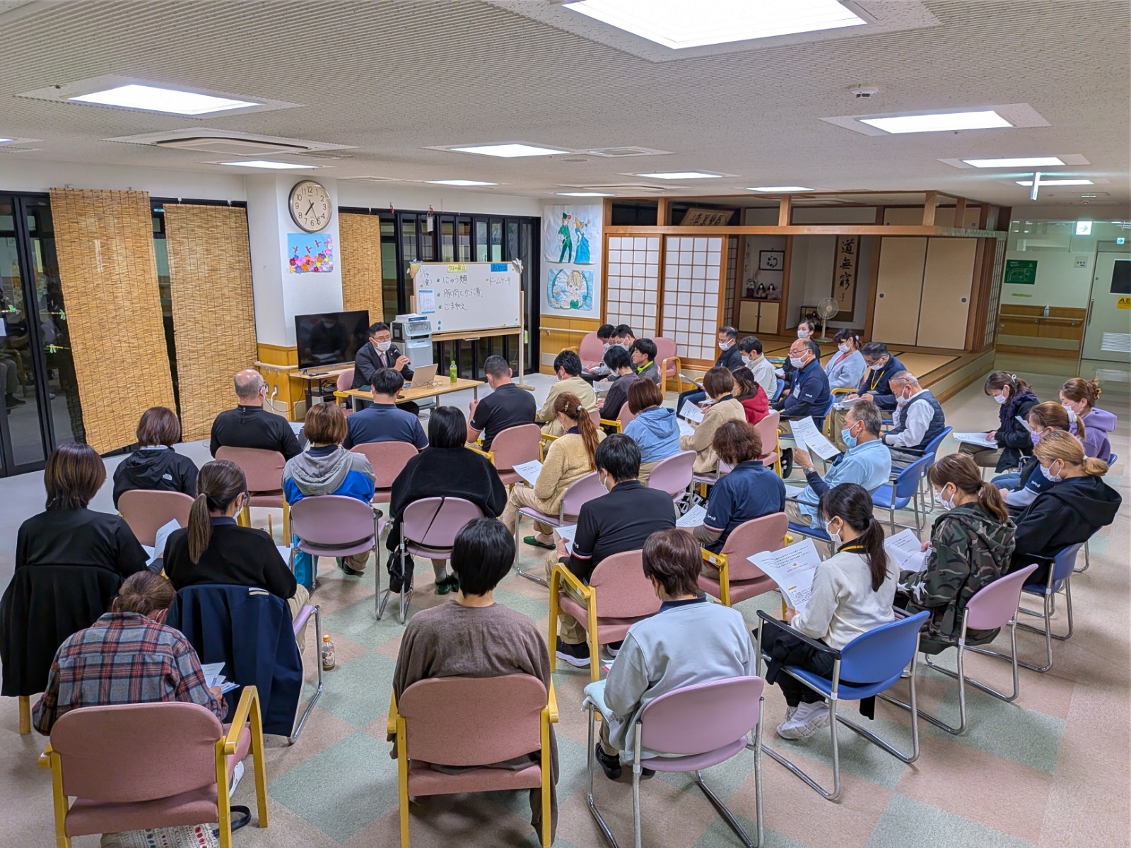 11月13日、職員全体会議を開催しました。 さわやか園、オーラックの稼働や課題点について、各部署から報告を行い、情報共有を行いました。 その後、当園の顧問である社会保険労務士の山田哲生先生をお招きして、職場のハラスメント対策を中心とした、働きやすい職場づくりについての講義・研修を行いました。